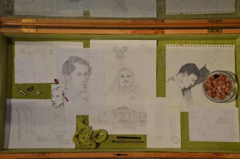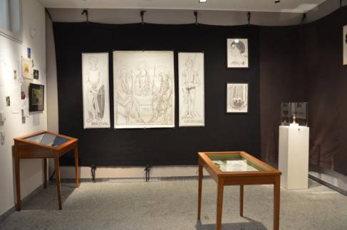 Here you have a bigger choice of photos from the exhibition. They start with the main wall and the drawings there, then there are the showcases, with some details and as well the anteroom, where the Richard Schwanwittchen Wagner, a sculpture in clay, is to see in a base showcase.